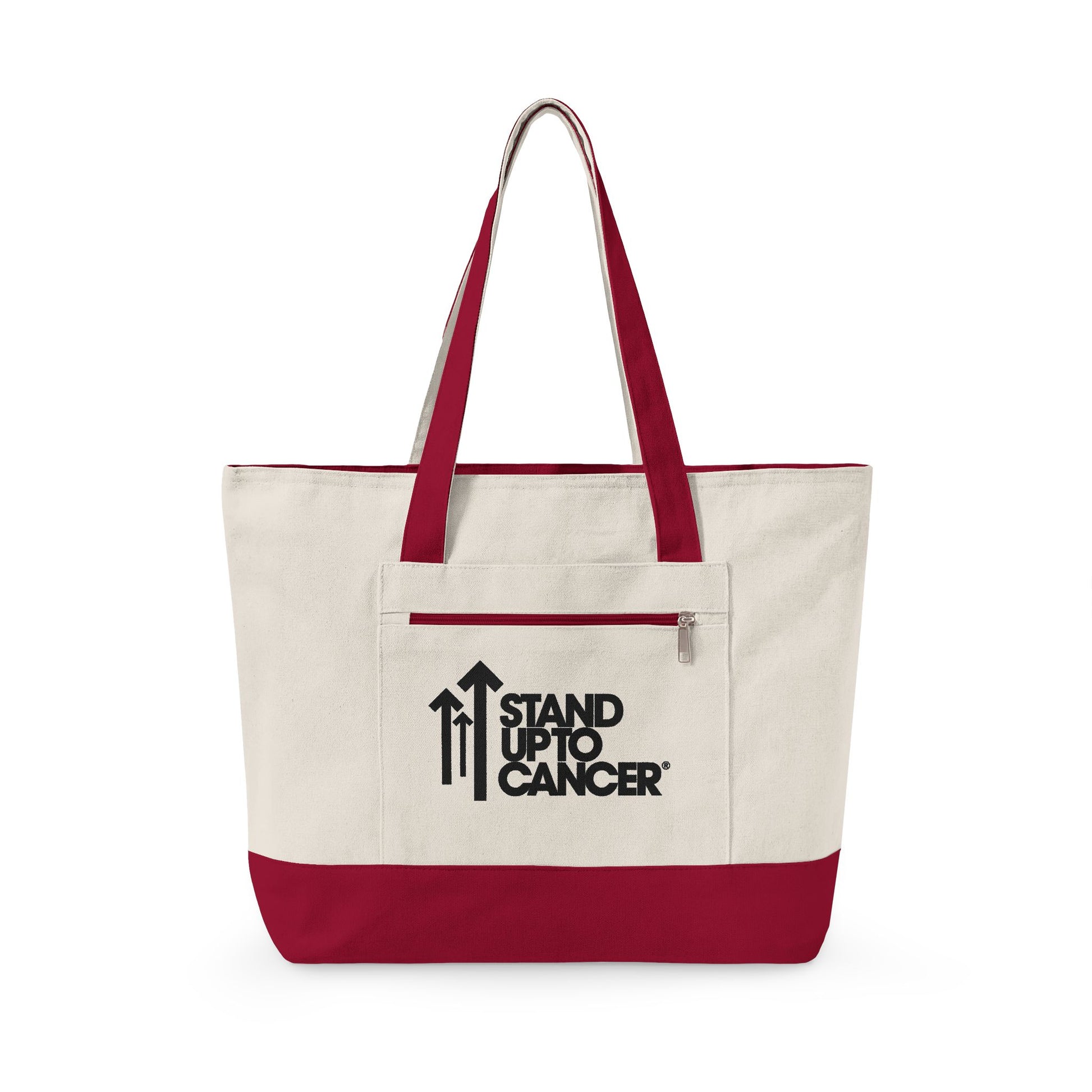 Be a part of the Stand Up To Cancer movement with this spacious Full Logo Zipper Tote Bag Red Trim.
